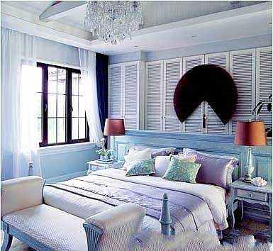 实用主义和浪漫主义可以在卧室中并存,蓝白色调浪漫而沉静,蓝色清透与白色的安静相互映衬,有着海一般的梦幻感觉,优雅的配色似如歌的行板,浪漫温馨,装点出如水一般纯净又内涵丰富的卧室氛围。