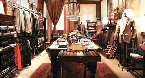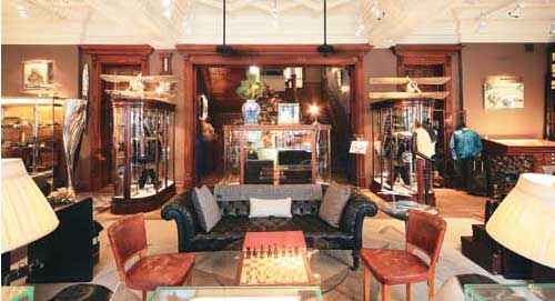 相对江诗丹顿间间分隔的室内空间,这里的空间更为开放宽敞。出于品牌展示的需要,整个一楼保留其全开放的布局,通过移动家具的分隔划分为探索发现区和一个好似私人书房的收藏区,中央区域还放置舒适的沙发和摆放着棋盘的茶几,晃如置身朋友家中,没有枯燥整齐的商品陈列,所有的商品被Dunhill全球形象及媒体总监Yann Debelle de Montby精心地设计摆放在他从世界各地游历收集的工艺藏品之中,古董的摩托机车搭配品牌的皮具,曾经的喷气式飞机机翼改成的书桌,在这里随时会带给你惊喜,每个角落都蕴藏着一段历史,一次经历,一个故事。