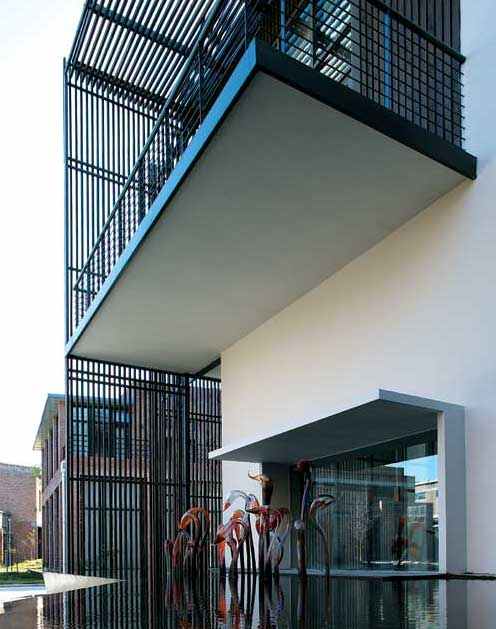 “艺术理应以一种朴素而高贵的姿态存在。我觉得过于浮躁激进的建筑不太适合这里,工业时代留下的历史痕迹值得珍视和保护,泛滥的设计只会使厂房原先的形态被破坏殆尽。我要做的是让新建筑以谦逊的方式在旧建筑上面继续生长。”看来张行的确经过不少思虑和选择,而所用的材料不过是防腐木、清水砖、混凝土、还有铁板和钢架,很是朴素寻常,这正是他想要实践的建筑材料。放眼环顾,有别于一号地艺术园里清一色的砖石建筑群落,璃墟呈现雅致而内敛的建筑面貌,亲切朴素又有如庙宇般的淡泊静谧,看似不经意间且流露出几许卓然的气度。砂地上竹影扶风,莲叶间水光潋滟,阳光在转折错落的栅幕墙上随意挥舞着时间的笔触。行至门庭,忽闻得头顶上传来喃喃细语却找不见人影,寻声暗问,才发现在高大的栅幕墙后面原来是人影绰绰、别有洞天。抬眼间楼阁若隐若现,舒展的穿廊和露台则凌空架在了竹丛流瀑之上,如此惬意的情境不禁令人浮想联翩:“今夜与谁同坐?明月,清风,我。”