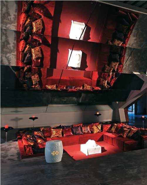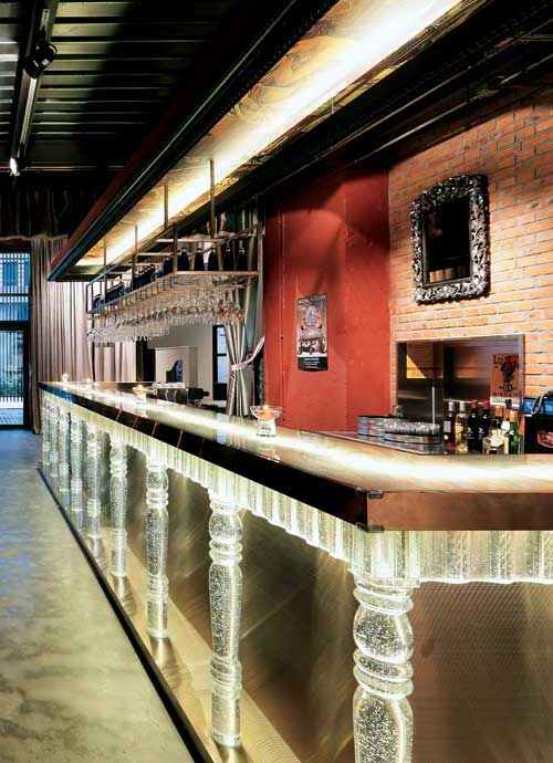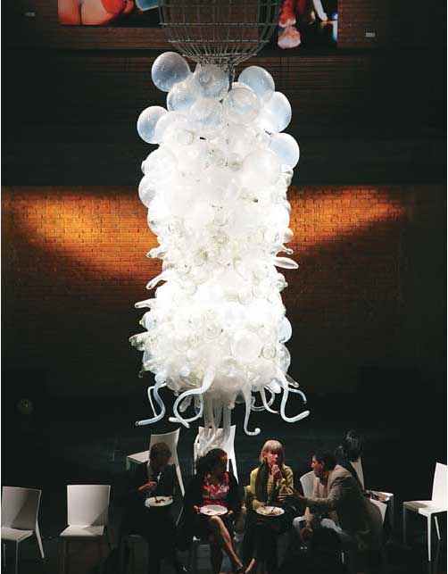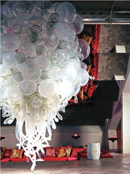 不觉间已是月上柳梢。此时的璃墟烛火阑珊,别样风情。璃墟酒吧开始演绎法式浪漫。用水晶玻璃筑成的吧台晶莹剔透,玻璃柱中的汩汩气泡在内置灯光的照耀下似乎也在上下翻动,犹如璃墟酒吧里的香槟在撩动着你的情愫,仰头望见镜子里折射出对面悬挂着的玻璃艺术作品,听说那是张行的新作,由手工吹制成的上百件玻璃泡泡组合而成。象是即将苏醒的花朵;象是月光下熟睡的珊瑚;更象是一位盛装起舞的佳人。