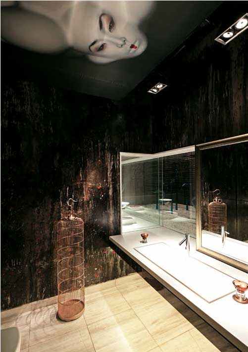 当我们醒过神来,才发现在这座诺大的艺术空间里很容易乱花迷眼,建筑内部有五层不同标高的空间错落,好像在玩艾舍尔的迷宫游戏,楼层之间又都可以相互观望,但如果想要相遇则需要上上下下做台阶运动。“我并没有刻意去设计动线,只是花了很长时间去考量如何在原有的建筑中生长新的空间结构,而不是任意拆改。”历史最应该得以保留,车间遗留的任何痕迹可能都有它存在的价值和意义,即便在十几米高的车间内建造出三个楼层,也是可以尽量用错开的挑空来保存建筑原有的高度和自然采光,原有的窗洞也在加建后得以保留利用,构成不同楼层之间相互观望的空间趣味。“每个人都有看与被看的欲望,窥视更可以唤醒童真。”说着说着,张行又显露出一贯的顽皮本色,随即带我们来到一些房门前。逐次进去看过才发现几个房间里是别有洞天,如同进入了他刻意导演的情景剧,视觉、听觉甚至嗅觉都截然不同,如果不是一不小心触动了机关弄出流水来,并且发现还有马桶在里面,还真不相信连卫生间也可以如此风情别样。有的可以在里面读着贴满墙上顶上甚至洗手池里的法国报纸,有的可以坐在马桶上欣赏窗外私属的竹园小景… …喔!谁说如厕就不能成为又有艺术又有幽默的体验?