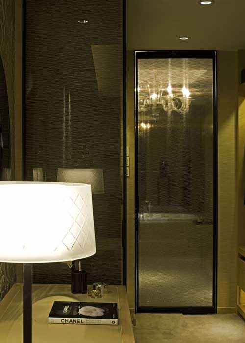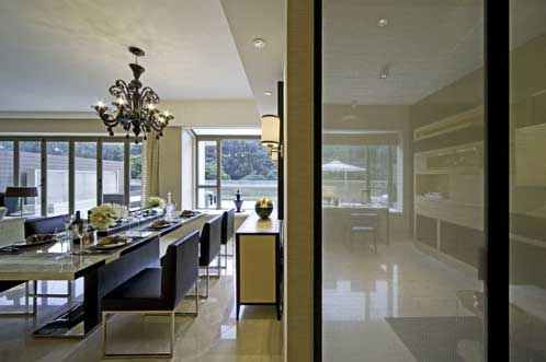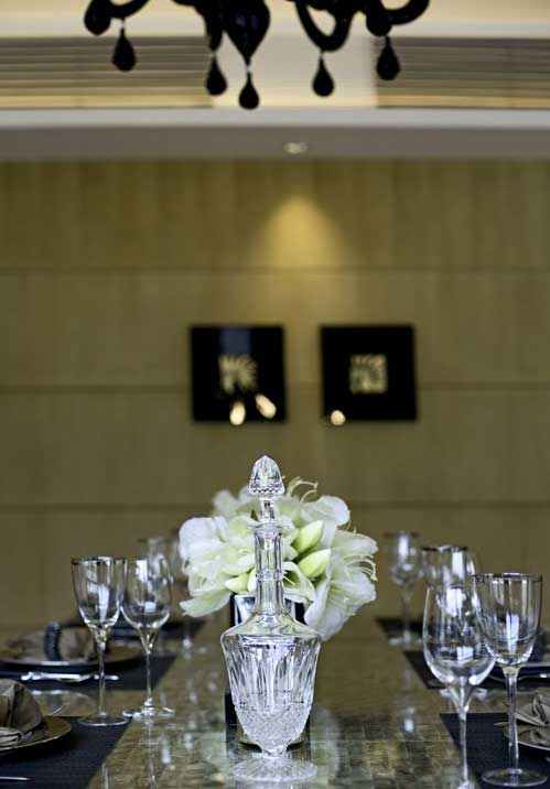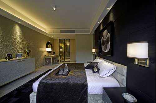 从客厅拾级而上来到主人房,米黄色的地毡、简洁的家具以及黑色的扪布床头靠营造了高贵的气质而不失温暖的感觉。开放式的更衣室以夹布玻璃门和主人房分隔,通过更衣室便来到主人浴室。迎门一面香槟金落地镜把浴室的范围无限伸延,作马赛克铺设的云石地台加上黑金花和黄窿石墙,在透明水晶灯的映照下,各自闪着独特的金光,光芒的交融造就一室贵气。