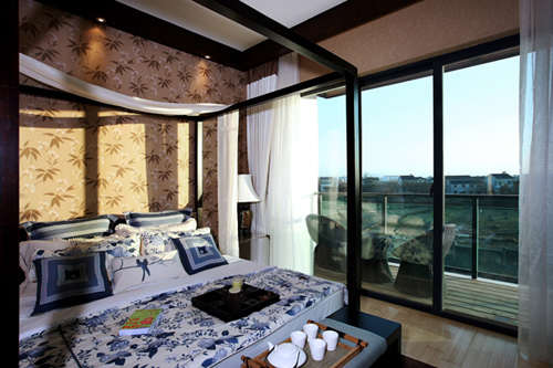 设计师巧妙的采用借景手法,使有限的空间加以延伸,内外景色连成一片,避免了园林中因空间狭小所造成的封闭、压抑感。东方气质的装饰物简洁自然,流露出完美的风韵。色彩层次的丰富,把各种深浅和色调的色彩搭配开来,彻底打破单调沉闷之感。
