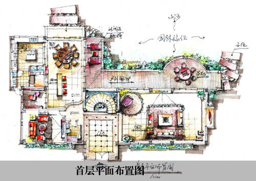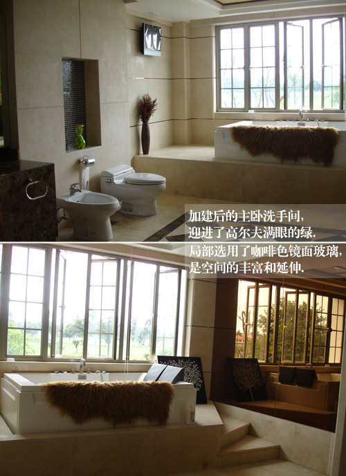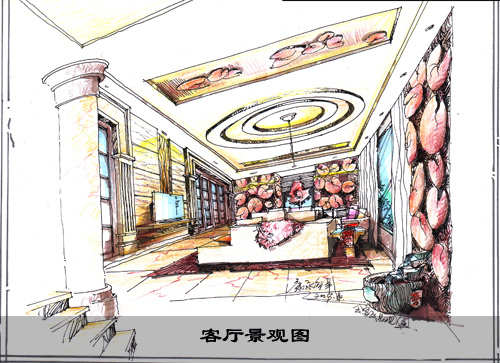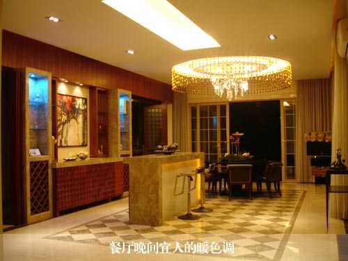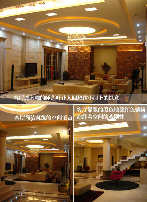 设计中以“水”、“莲”为主题元素进行室内外的对接,入门口弧形楼梯下的睡莲池即贯通了与二楼的视觉空间,同时视觉上又与左边餐厅、右边客厅的落地推拉门外的河面相连接一直延伸至远处绿色高尔夫球场的草地;池中的睡莲、天花及墙面(局部实木雕立体)的睡莲、与室外小河中的睡莲浑然连成一体,进入了室内又融入到了大自然当中……