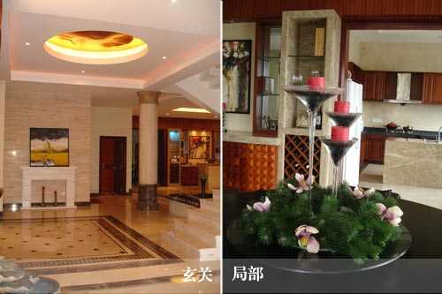 整体装修及配饰设计都非常注重选材,室内地面、墙面以沙安娜米黄、白洞石为主,配以浅啡网、沙贝利木饰面索色、黑檀木及浅土黄色墙面涂料,使整体色调降低了明度以高级灰色调为主,凝重沉稳中又不失一份浪漫色彩。