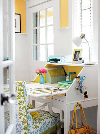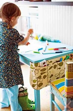 装园艺工具的帆布袋经过一点微小改动后成为孩子们的画笔收纳袋,尼龙搭扣的设计让袋子伏贴于桌子旁边,从此宝贝儿的画笔就不会再到处乱滚了。