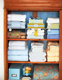 一个置物架就可把毛巾、床单等家纺用品尽收“腹”内。首先要把毛巾类和床单、被罩类分开存放。毛巾可以按颜色分摞叠好,床单则可以按尺寸叠成方块,将枕套纵向叠成条状围在床单上,再根据不同的使用季节打上标签区分。