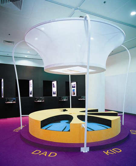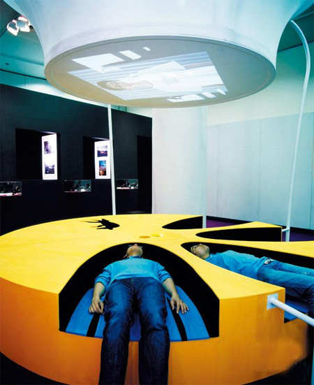 进一步深入展馆,醒目的家庭与家主题黄色平台映入眼帘。参观者可以全身躺卧在平台上,透过设计特定的角色:爸爸、妈妈、兄弟姊妹等家庭成员,聚集在一起,仰卧观赏天花板上以独特造型设计的照片:一系列婴孩及学生时代配有文字纪录的照片、家庭快照、纪念日及许多家庭日常生活的琐碎照片,而且,还配有一些录音。