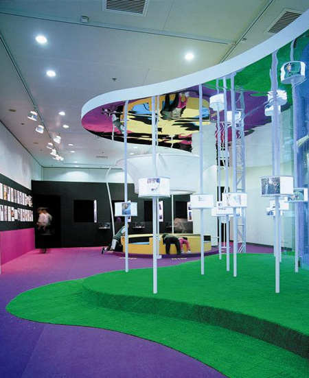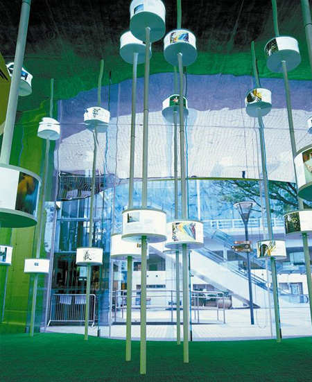 左边的学生自塑像的右侧是一个波浪纹造型的平台,地台的设计与铁枝造型相互连接。参观者通过直接转动内置学生作品及相片的盒子,从而了解学生们的人生观。青绿色的地台,纯粹白的铁枝、桌椅与外围的自然环境透过玻璃窗融为一体,室内外空间合二为一。