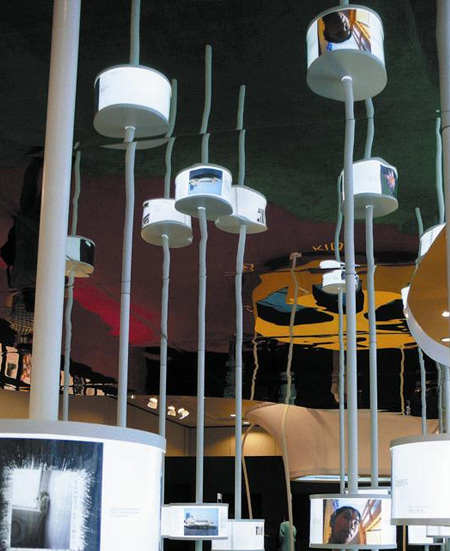 整个展馆设计以不同的主题区分成不同的区域。走进展馆,左边的白色墙壁上镶嵌的是自塑像,基于“我是谁?”的主题,墙壁上一个个画框内的是学生自己的照片,或是拍摄出能代表自己的个别对象的照片。参观者透过观赏这些充分代表学生们自我形象、对外界观感的照片,了解学生们的想法,这是沟通对话的桥梁。