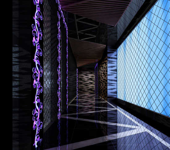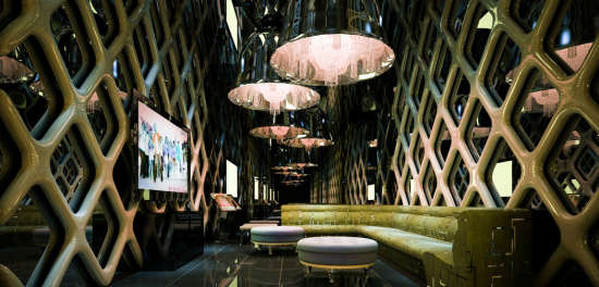 在设计手法上运用了超现代的元素,因为空间层高足够,在大厅顶面及墙面做了很多视觉上的层次,灯光的相继结合,让整个空间打破方盒子的束缚,营造出神秘的感觉。