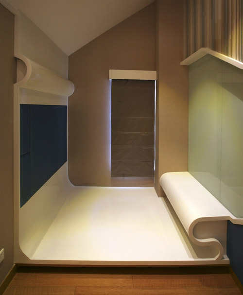 来到三楼,小孩房间的空间及设计功能上展示了灵活性,自由曲线到处流动。走完小孩房间,你会发现空间是没有角落的,曲线构成了室内的布局。这样的曲线从墙面入口开始,延伸到墙面的角落。这样,不仅扩大了空间的视野,同时制造出了一个温暖的感觉,创造出了整个小孩房间充满活力的气息,让孩子们抒写着自由和梦想,正是这些纯粹的元素组合才构成了如今这个丰富多变的空间,由此也能感受及体现出客户的用心良苦及对孩子的责任和爱护。本案中三楼主卧室的设计极为精彩,创造出了一个以往任何高直空间都不具备的、打破简单几何秩序性的冲击力,曲面层叠起伏、光影倾泻而下,直透人心的二层空间,它就像是远方飘来的一朵云彩,在震撼中感受着悠扬的美感。在此设计下,黑白的艺术效果调动起主人全部参与艺术生活的心理准备,在马鞍皮革、橡木饰面板、银箔、夹丝玻璃不断穿插的材质变化下,踏上与寻常主卧不同的设计风格。
