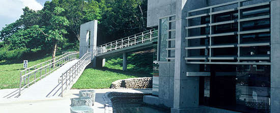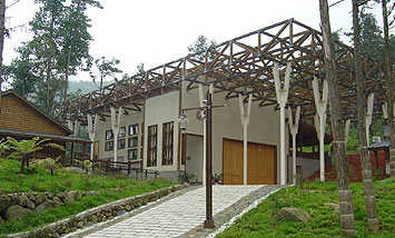内湖国小位于南投县鹿谷乡,学校基地位于往溪头风景区路旁(延溪公路)一片以人造杉木林为主的坡地上。基地型状略呈方形(130m×165m),其地前后高低差约25~30m。开始进行基地勘查的时候,在腰部以下都是厚实的植被,上方则是蓊郁浓密的树荫,满山遍野都是一个绿色,一个触摸得到真正活鲜的“森林”,因此郭建筑师在设计初念,便想像在森林中的学习场所应该是什样子?希望藉由这样天然的环境,赋予传统教室不同的规划。