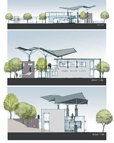 1)在配合建筑物而一体设计的棚架上安装太阳能板,以可调式立面遮阳板、太阳能发电设施的特殊造型表现,有助于对学子宣导。