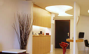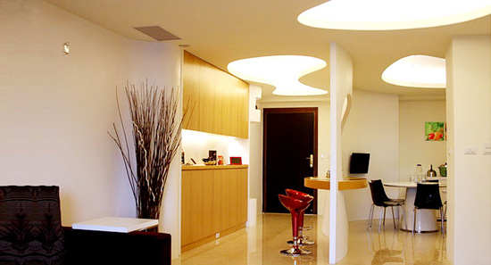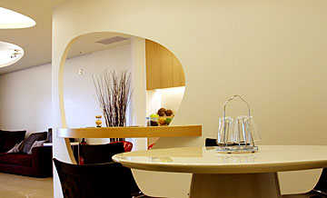 本案由于入门到客厅有一大空间,是属于餐厨廰,基于中国风水格局来说,开门是不见餐厨廰的,因厨房有水有火,容易影响空间的安定度,一见光财会露白流失掉,见到餐厅则让人觉得有被吃光的感觉,杨设计师于是在大门入门后设置一道墙,在中间处做成了圆弧半镂空吧檯,化解掉以上的问题。界定出两个空间的分野,也保留了空间的开阔感,韵律线条中……总是有可思量的线索。