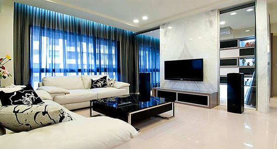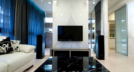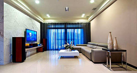 银狐石的电视墙下方开口排列出木板架,可放置音响影音设备,打上特殊灯光后,别有洞天的感觉让客厅多了层次的变化,云游四海的阔居印象,L型极简沙发一登场,空间其实不用再太多的装饰品,反而有更出人意境的表现。