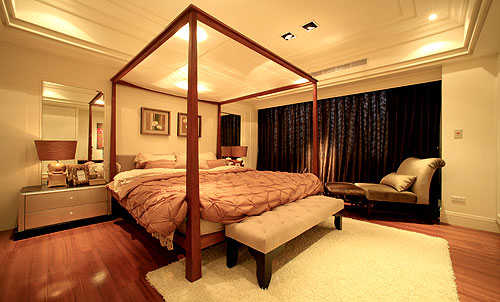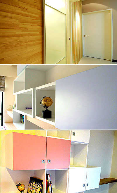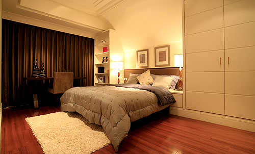 美学与实用论的收纳设计,运用不规则方格上下左右俏皮变化,让床头与墙际充满了随手可得的置物乐趣,木作床放上弹簧垫即是温暖的窝,床底就是两个收纳柜,整排书桌化妆檯两用的开阔度,整个房间就像是座万用屋。另一主卧室则将整墙的衣柜雾面化,中间一道木作墙面适时的崁上液晶电视,上方再加诸灯光照射,两侧的衣柜瞬间成了最闪亮的舞台背景。