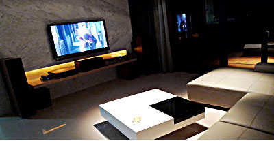 整面石材毫不吝啬崁上液晶电视,木作墙柜延伸整个凸面为背景,天花缝中隐藏投影帷幕与投影机,生动的家庭视听电影院就在墨紫沙发中澎湃上演。