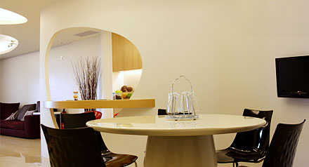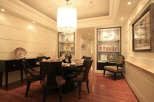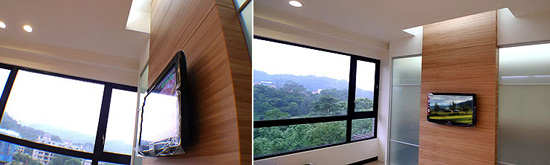 用餐风景别有洞天,圆弧框景中有着跳跃视窗的风味,时尚亮黑餐椅与空间留白的液晶电视成对应。