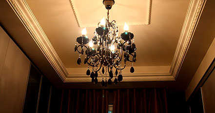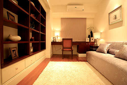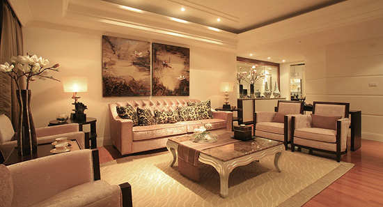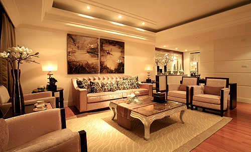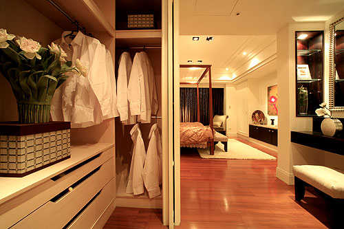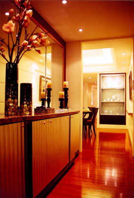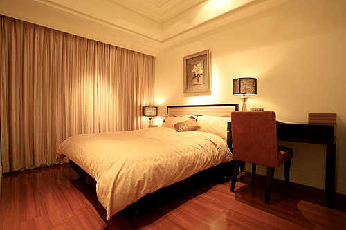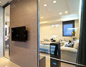 穿戴名牌时尚的辅助灯光,一盏华丽的水晶灯饰是必需的,两墙面艺术涓花内藏着女人当家的风情,半雾面收纳格是最菁华收藏版,也许俩俩相伴偶尔也需要独处的时光,因此特别应女主人要求,崁上了液晶电视变成了私赏韩剧的小型电影院。