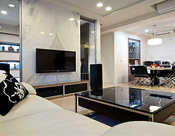 以大理石做电视墙,对应着黑云石客桌,黑白对立却融合无边的想像,两侧则为大片透明玻璃,穿透至书房,机动式拉帘可以随时区隔两室的用途,从细节裡慢发酵出来的,不只是功能的多变,还有着平衡与衝突的美学感受。