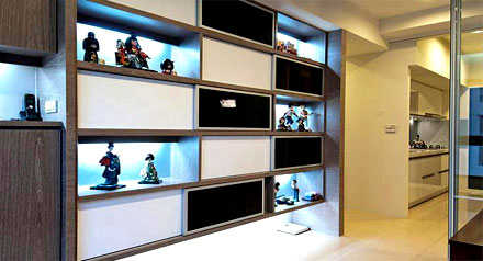 在客餐厅与卧房间的过渡处,整面墙设计了内凹式的柜体,崁上隐藏式的灯箱照耀,让开放的展示艺品藏书,成了最有艺文习气的文化廊,这种完全不佔空间争取出新空间的收纳方式,让空间更有宽度。