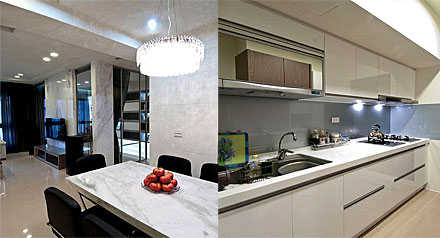 黑白线条石材的吧檯设计,缀上一盏时尚水晶垂灯,茶镜基座为隐藏式收纳,倒T式抽油烟机,冷冽却简洁点出厨房的华丽舞步,在这个美味空间中,品一道餐、饮一杯LATTE都是极致的生活诗意。