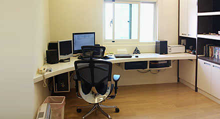 特别设计圆弧式书桌,让动线利用更明快广远,下方以悬空的收纳柜,可以放置pc电脑主机,防止放置地面的潮湿问题,且更符合操作时的人体工学机能。