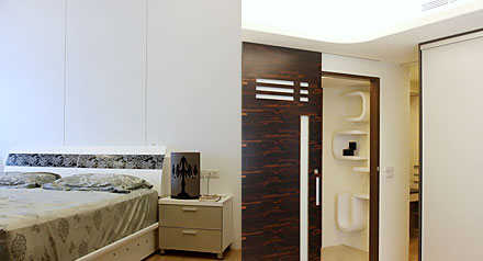 由于房门都在走道间,特别订製的房门,镂空半透光设计可引进更多光线,并设计为左右拉式开门,让空间感更大,整个纯白搭配上摩登傢俱,总是涌进了爵士蓝调的节奏。