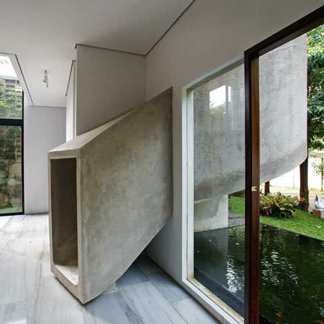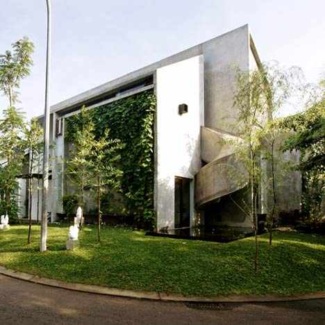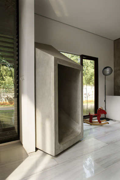 这个住宅有一个连接厨房和孩子卧室的旋转混凝土滑道。这个两层的住宅有一个外露的混凝土表面,部分被植物覆盖,狭长的窗户和落地的透明立面时不时出现。这个住宅供一个三口之家居住,但是家里真正的皇帝是一个5岁大的小男孩,他的生活真谛就是玩耍,所以才会有了这个设计。
