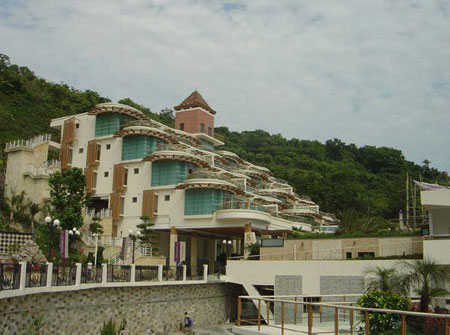 项目分三期开发,一、二期为 11 栋低层、联体退台式高档度假公寓和豪华会所,占地面积4.6 万平方米,建筑面积1.34 万平方米,公寓分A、B、C、D多种户型,总共 69 户,户户有观海大露台,充分体现了“天人合一” 的设计理念。