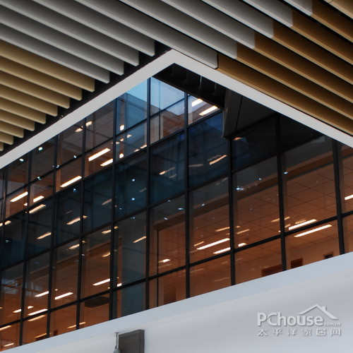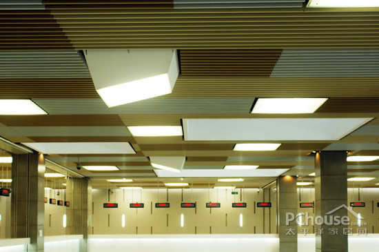 报关大厅的顶部,我们利用了条状彩色铝板的特点,形成了平面化的pattern。在组织色彩的时候,米色、白色、棕色为办公室空间注入了温暖的情绪。