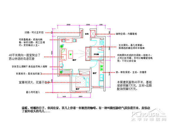 网友希望风格以现代、简约为主,希望能营造温馨的感觉。希望要浅色调,但不要全部白色显得很单调。居室主要想营造一种给人一进门就感到宽敞、大气,要有品位。重点分配在客厅和餐厅,因为经常会有朋友到访。本案例建筑面积48平米,48平米南向一居室契合了西山林的鸟语花香,整体的基础装修预算7万元,主材+后期配饰预算5万元。