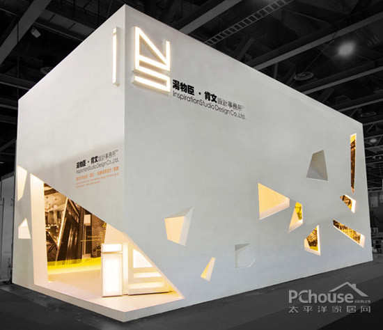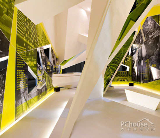 【太平洋家居网 设计频道】展位的空间造型为半封闭式,由于场馆已布满充足光源,而体块主要以投影或液晶展示作品为主,为了不影响正常采光及体块内的空间流通,设计采用了“烟囱效应”结构造型,既可以解决局部采光又可以解决空气流通问题。每个“烟囱”都赋予一个较独立的空间功能,“烟囱”与“烟囱”之间既开放又独立。