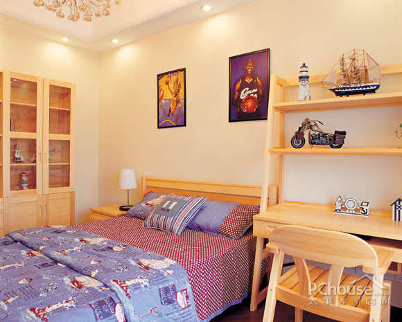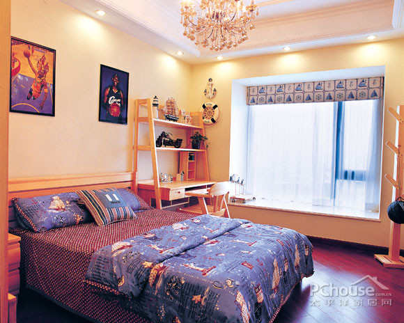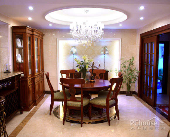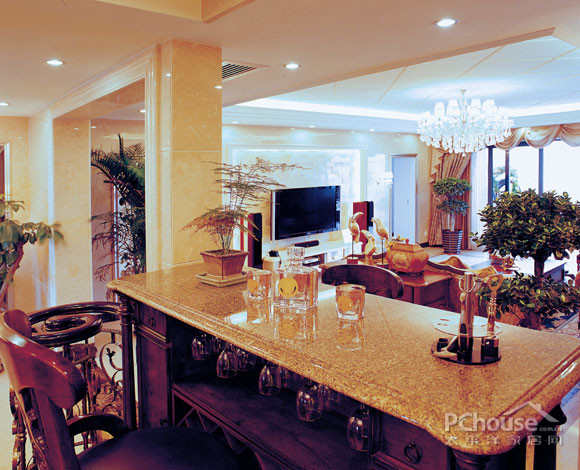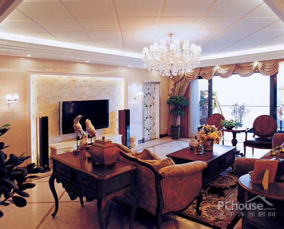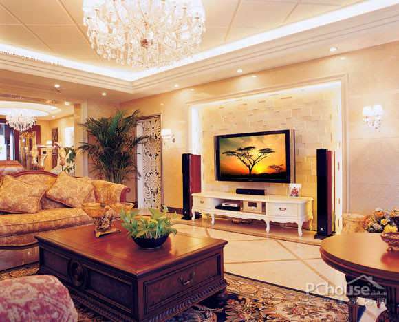本案样板设计以美观华丽的美式风格为基调,电视背景墙体现出了设计师的独具匠心,右边是书房的暗门装饰造型,左边是同样装饰性的白色木雕,强调了设计构思中对环境氛围对等的注重,丰富了空间的层次感,展现一种精致的生活场景,更延伸了室内的居住空间的效果,它不但显示了室内的典雅和气派,也会被各种精致的装饰而吸引,在融入了设计师无限的交流、思想的延伸!通过完美的典线,精益求精的细节处理,带给主人不尽的舒服触感,和谐是家的最高境界。