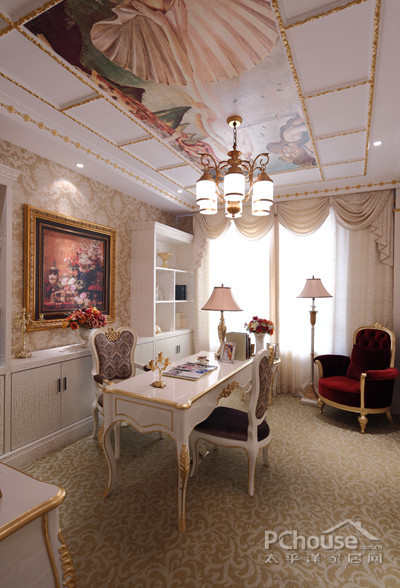 本栋建筑外观为欧式古典风格,室内装饰风格亦延续了外观,取得一致,采用北欧俄罗斯风格,大量采用了欧式的顶角线,罗马柱,金箔镂花装饰线,护墙板,壁炉等元素,在客厅吊顶中金箔装饰点缀其中,地面浅黄色和咖啡大理石相拼,不张扬地将奢华感体现。卧室,书房等处选用米色系的壁纸和暖色系的灯光,温馨感扑面而来,整体为白色和金色,大方,稳重,奢华,一盏盏金色的水晶吊灯和壁灯,让整个空间变得豪华起来,同时多了些许柔美的韵味。