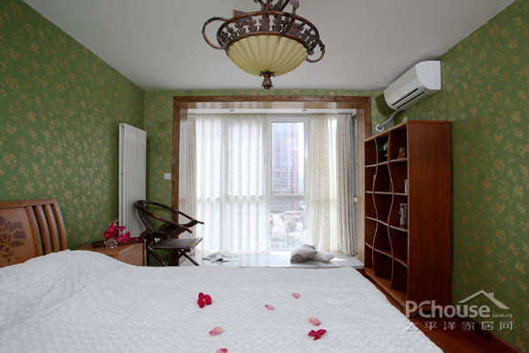 壁纸选用了翠绿的色彩点缀的金色花,及清新亦古典。通透的玻璃瓶与美丽百合柔和了木质家具的沉重。利用柔和的灯光调节,让卧室显得温馨而宁静。中式的标志性元素时隐时现,成了卧室的一个平衡器。