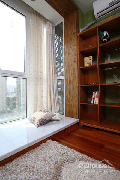 卧室的家具有一个特点,就是直线与曲线的搭配。床的直线与摇椅的曲线,书柜的曲线设计与飘窗的直线,吊灯的曲线与墙面的直线,搭配得非常漂亮,卧室的浪漫顿时营造出来。