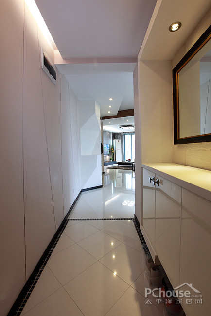 玄关:入门处的位置是门厅的设计,门厅的一侧可以放置一个收纳柜,既方便出入时候物品的摆放,柜底也可以搁置鞋子,充分满足屋主对于储物的要求。在收纳柜的上方可以悬挂一面镜子,有利于扩大空间感。