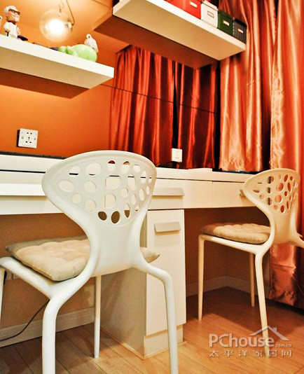 衣帽间:衣帽间同时也是梳妆间,也可以充当小型的书房使用。鲜艳的色彩搭配适合女性的品味,隔板的设计既可以作为装饰,同时可以作为收纳之用。