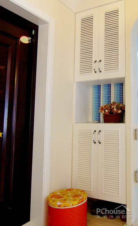 玄关:玄关柜做顶,底部悬空,方便出入门换鞋,中部腾空,可以摆放随手物品。其余的就是一整面的收纳。