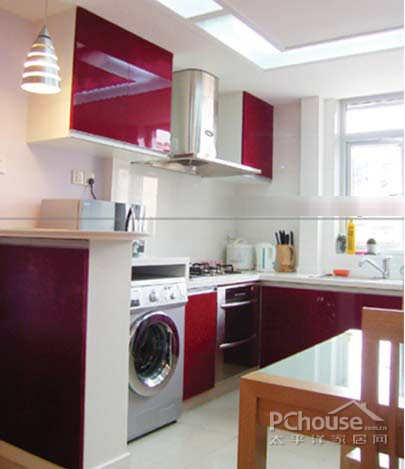 厨房:下上都做了充分的收纳设计,同时还把洗衣机收纳于其中,不过在设计上要流畅些,注意其中的边边角角,为了以后孩子的安全问题。