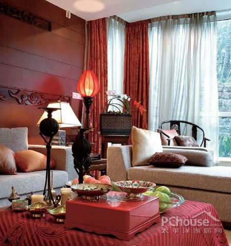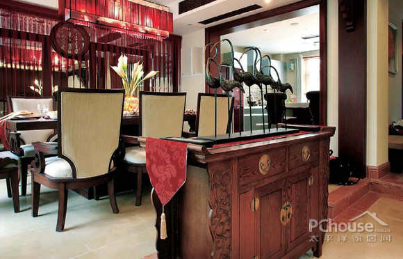 大厅暖暖的色调与中式家具、配饰的完美搭配给人视觉带来趣味与美感,让人仿佛置身于梦境一般。感觉舒适又梦幻。