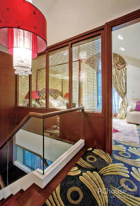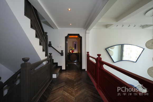 木制围栏和地板加上扇形的装饰,连门框的也增添了古代常用的图案坐衬托,体现古典宫廷味十足。漫步在走廊中也能感受到古典气息。