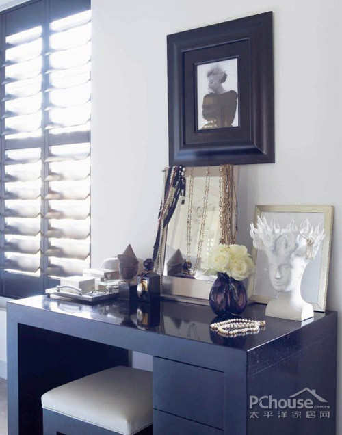 一把老式椅子放在最显眼的床的旁边,梳妆台上有Kelly的家庭照和玛丽莲·梦露的另一张照片。Kelly设计的黑木的带日式风格的衣橱将组合电视和她的衣服很好地遮掩起来。