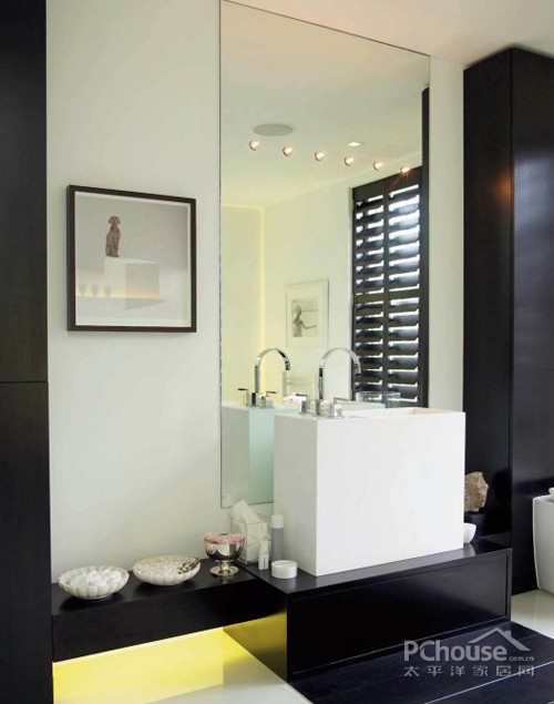 白色的卫浴洁具配合黑木地板和储物柜,格调高雅,不容忽视。