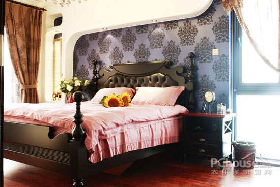 卧室改造:主卧室床头的造型满足了丰富视觉的同时巧妙的形成了一个梳妆台达到了功能至上的目的。