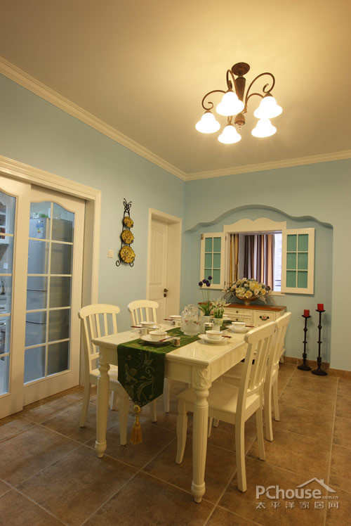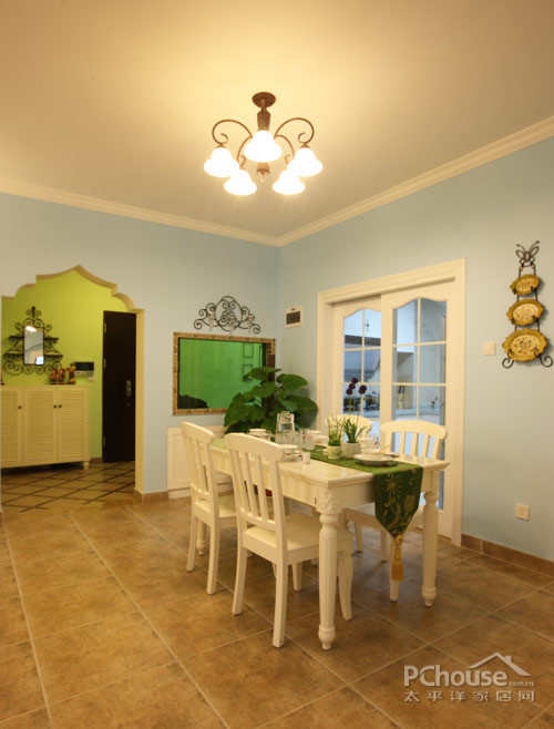 当然,你也可以拿水笔在玻璃留言板上写些留言及祝福语,增加家庭的温馨气氛。淡绿的墙面与深绿的窗棂,仿古砖地面与田园家具,墙面的铁艺饰品……