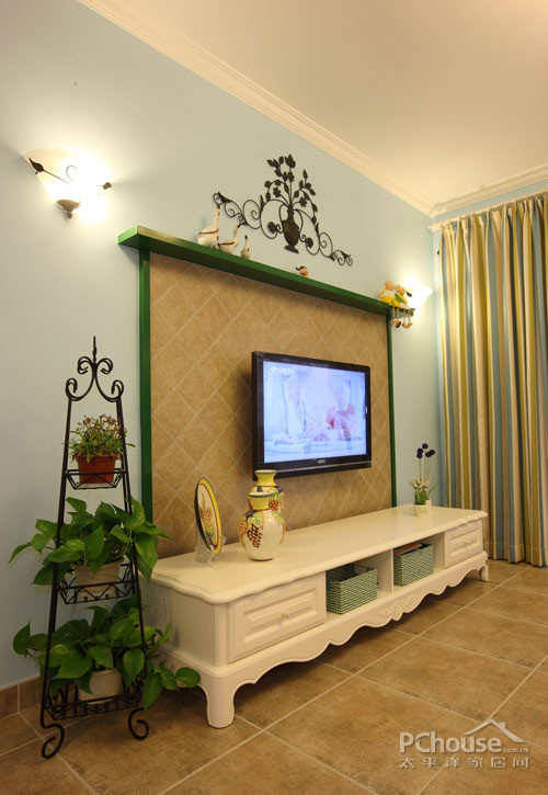 电视背景墙则用大理石砖外加绿色木制层板制作而成,木架上摆放着一些特别的园艺小玩艺儿。为了空间的整洁,墙壁走暗管形式将电线隐藏。选择色彩适合的收纳盒。没有杂物,整个空间显得简洁而活泼。
