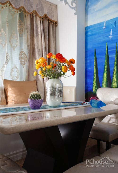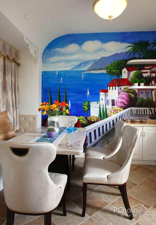 餐厅,侧边墙面用了手绘,无际的海洋,和蓝天交融到一起,视觉上增大了空间。